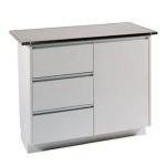 Exam Tables and Cabinetry allow you to work efficiently in an organized, space-saving environment; giving your facility a professional look, that your staff and clients will appreciate. Cabinet body panels are constructed of 45-lb. density, industrial-grade substrate, panels are machined on a CNC machine for accuracy. Panels are dadoed and rabbetted for tight-fitting joints. Joints are glued with adhesive impervious to liquids and mechanically fastened to ensure a solid, sturdy cabinet. All cabinet interiors are finished with Thermo-Fused Melamine, making them water, odor and chemical resistant.